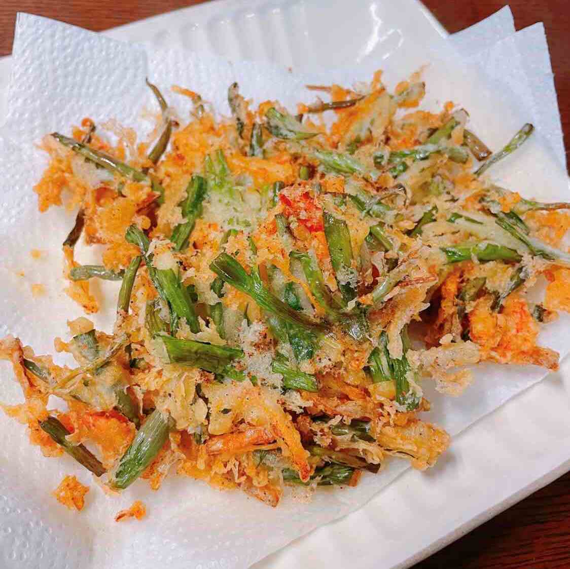ネギ苗のかき揚げ 2022.04.27 2022.03.01材料(2人分)下仁田ネギ苗 適量桜エビ 50g塩 小さじ1/4薄力粉 50g水 1/4カップサラダ油 適量1 ネギ苗は小口切りにします。2 ネギ苗、桜エビ、塩、薄力粉を混ぜ合わせます。3 全体にころもがよくなじむように水を少しづつ加えます。4 薄力粉と水がなじんでまとまりが出てくるまで混ぜ、4等分にします。5 フライパンにサラダ油を注ぎ、170~180℃に熱します。6 約2分間揚げます。ときどき、おたまで油をかけてあげます。7 表面が固まってきたら上下を返し約2分間揚げます。8 カリッとして全体がきつね色になったら出来上がりです!